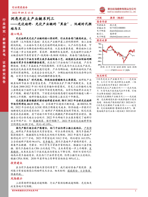 【东亚前海证券】【20220913】洞悉光伏主产业链系列三:光伏硅料:光伏产业链的“黑金”,双碳时代拥硅为王-44页 行业研究