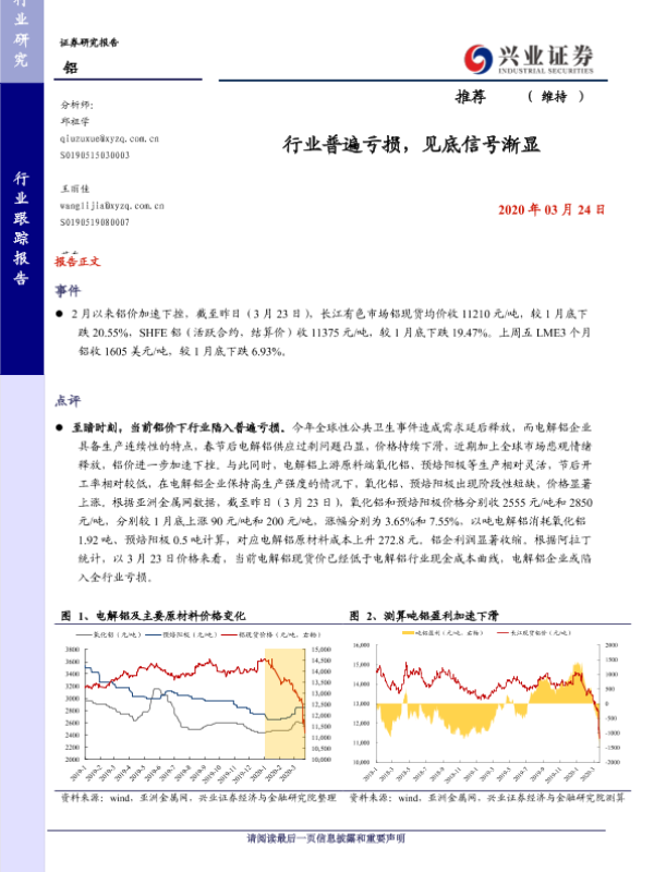 【兴业证券】【20200324】铝行业跟踪报告:行业普遍亏损,见底信号渐显-4页 行业研究