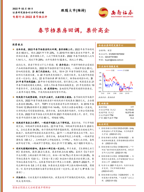 【西南证券】【20220209】电影行业2022春节档点评:春节档票房回调,票价高企-12页 行业研究