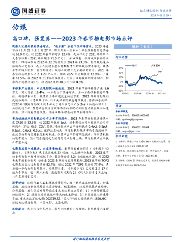 【国盛证券】【20230129】2023年春节档电影市场点评:高口碑,强复苏-14页 行业研究