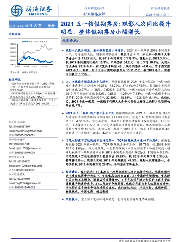 【海通证券】【20210507】2021五一档假期票房:观影人次同比提升明显,整体假期票房小幅增长-2页 行业研究