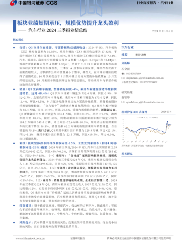 【银河证券】【20241105】汽车行业2024三季报业绩总结:板块业绩短期承压,规模优势提升龙头盈利-27页 行业研究