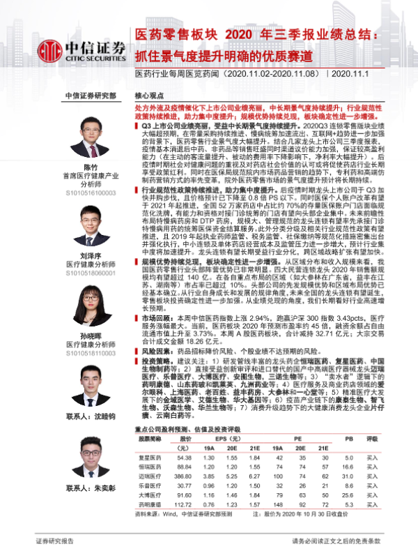 【中信证券】【20201101】医药零售板块2020年三季报业绩总结:抓住景气度提升明确的优质赛道-46页 行业研究