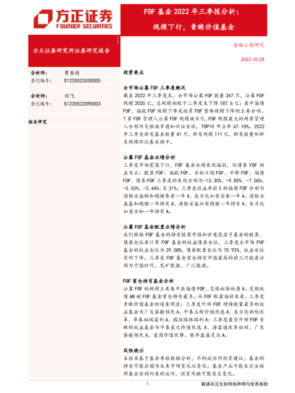 【方正证券】【20221028】FOF基金2022年三季报分析:规模下行,青睐价值基金-18页 行业研究