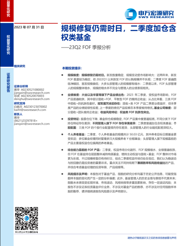 【申万宏源】【20230731】23Q2FOF季报分析:规模修复仍需时日,二季度加仓含权类基金-25页 行业研究