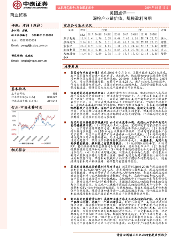 【中泰证券】【20190910】商业贸易行业美团点评:深挖产业链价值,规模盈利可期-26页 行业研究