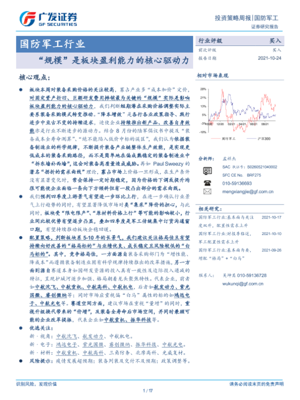 【广发证券】【20211024】国防军工行业投资策略周报:“规模”是板块盈利能力的核心驱动力-17页 行业研究