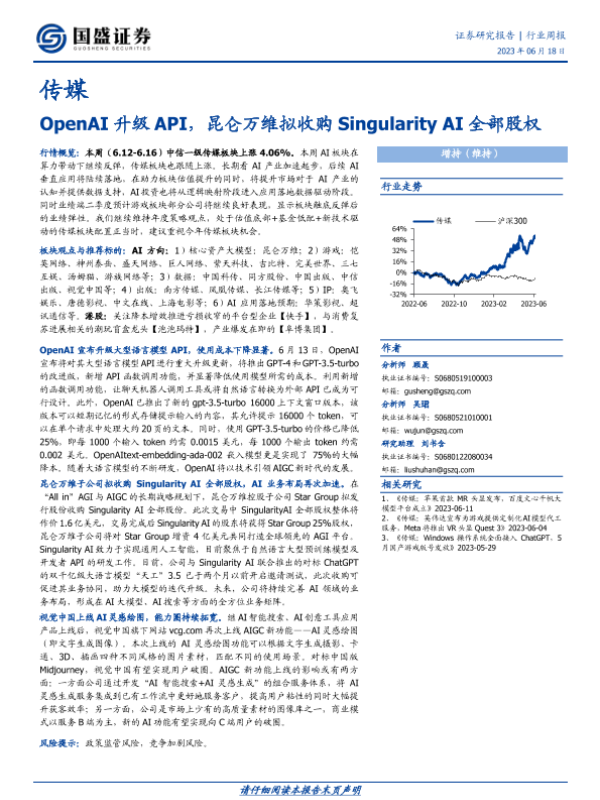 【国盛证券】【20230618】传媒行业周报:OpenAI升级API,昆仑万维拟收购Singularity AI全部股权-10页 行业研究