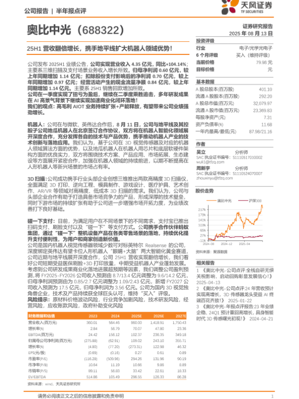 【天风证券】【20250813】25H1营收翻倍增长_携手地平线扩大机器人领域优势-3页 证券期货研究报告