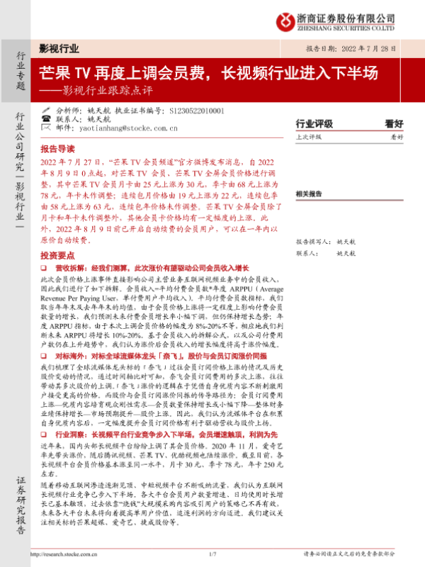 【浙商证券】【20220728】影视行业跟踪点评:芒果TV再度上调会员费,长视频行业进入下半场-7页 行业研究