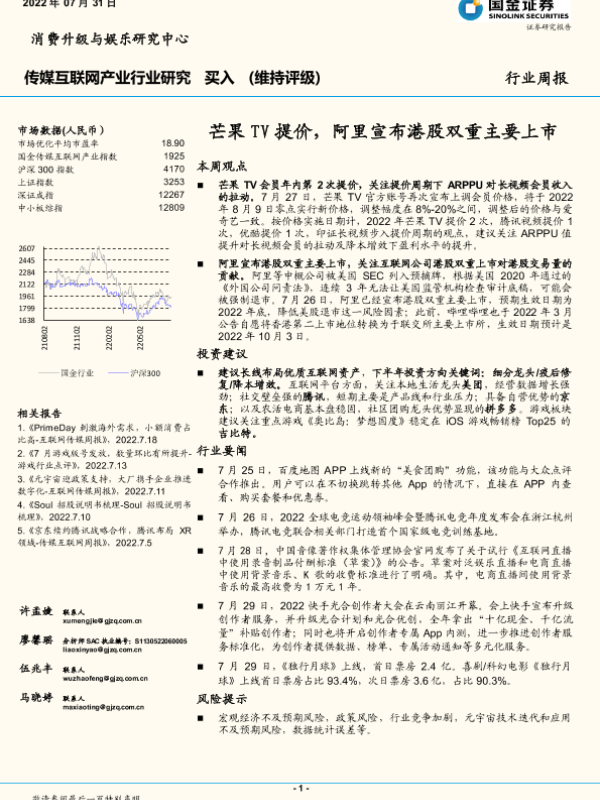 【国金证券】【20220731】传媒互联网产业行业研究周报:芒果TV提价,阿里宣布港股双重主要上市-18页 行业研究