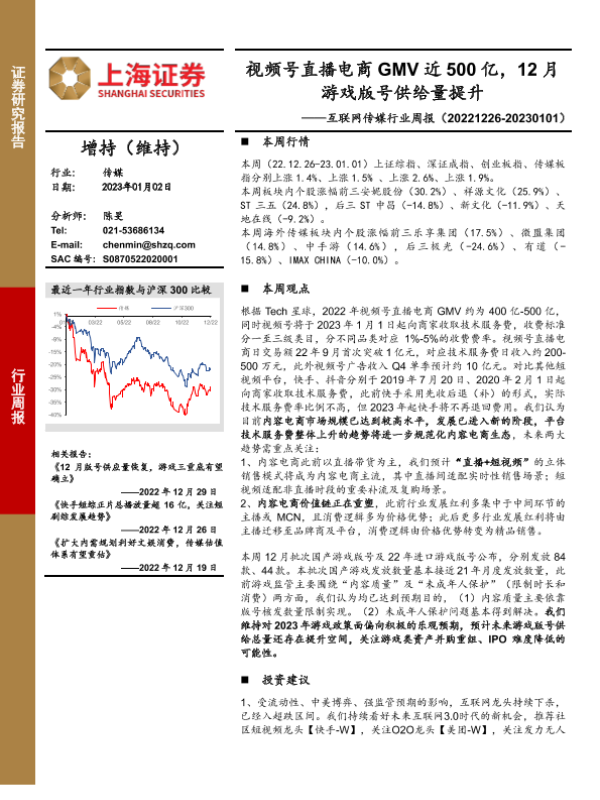【上海证券】【20230102】互联网传媒行业周报:视频号直播电商GMV近500亿,12月游戏版号供给量提升-22页 行业研究