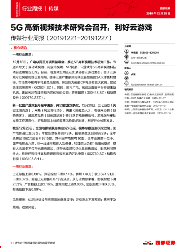 【西部证券】【20191229】20191229-西部证券-传媒行业周报:5G高新视频技术研究会召开,利好云游戏-15页 行业研究