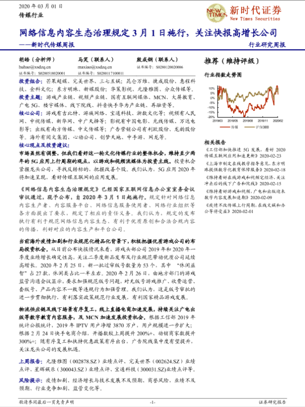 【新时代证券】【20200301】新时代传媒周报:网络信息内容生态治理规定3月1日施行,关注快报高增长公司-37页 行业研究