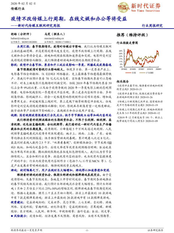 【新时代证券】【20200202】新时代传媒互联网研究周报:疫情不改传媒上行周期,在线文娱和办公等将受益-34页 行业研究