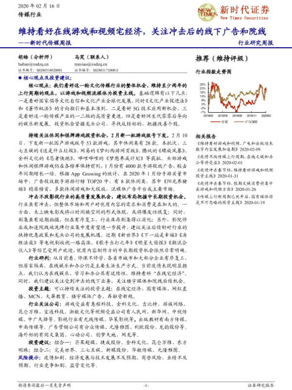 【新时代证券】【20200216】新时代传媒周报:维持看好在线游戏和视频宅经济,关注冲击后的线下广告和院线-34页 行业研究