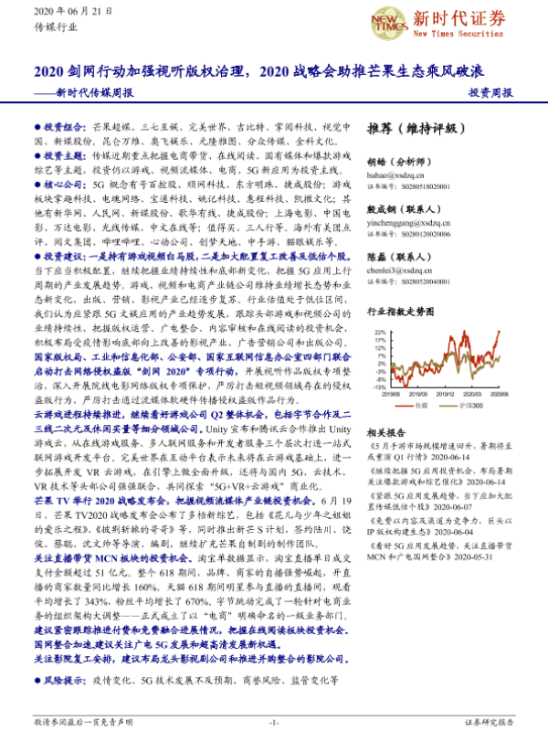 【新时代证券】【20200621】新时代传媒周报:2020剑网行动加强视听版权治理,2020战略会助推芒果生态乘风破浪-40页 行业研究