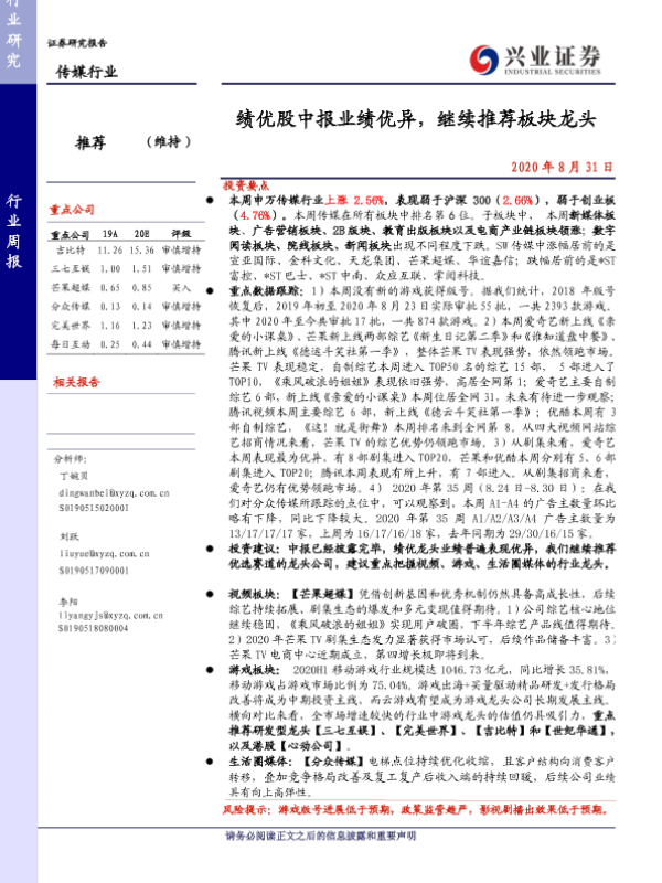 【兴业证券】【20200831】20200831-兴业证券-传媒行业周报:绩优股中报业绩优异,继续推荐板块龙头-16页 行业研究