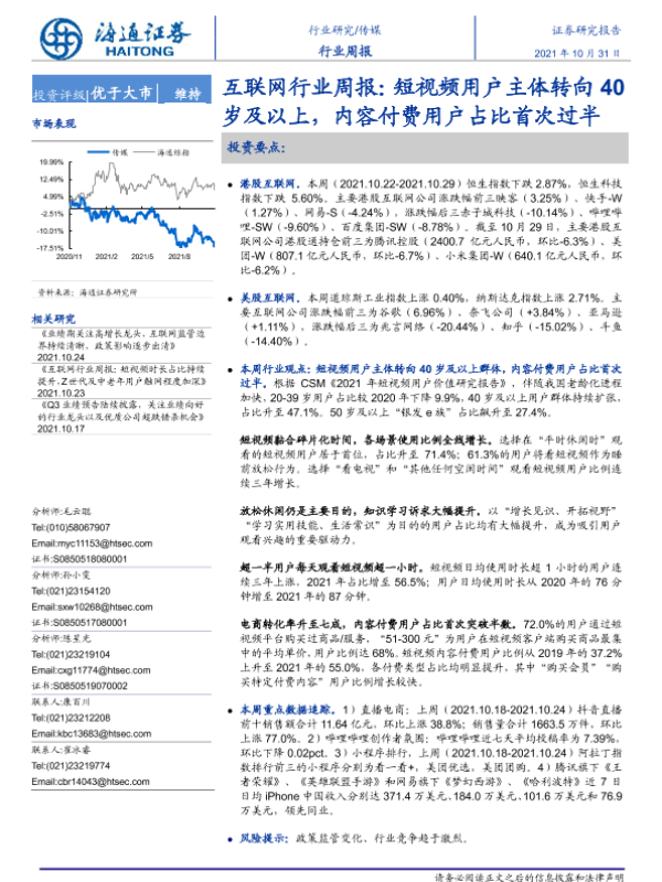 【海通证券】【20211031】互联网行业周报:短视频用户主体转向40岁及以上,内容付费用户占比首次过半-10页 行业研究