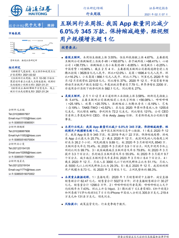 【海通证券】【20210207】20210207-海通证券-互联网行业周报:我国App数量同比减少6.0%为345万款,保持缩减趋势,短视频用户规模增长超1亿-13页 行业研究