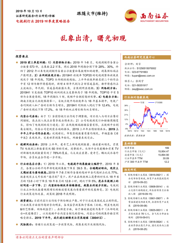 【西南证券】【20191013】电视剧行业2019四季度策略报告:乱象出清,曙光初现-37页 行业研究