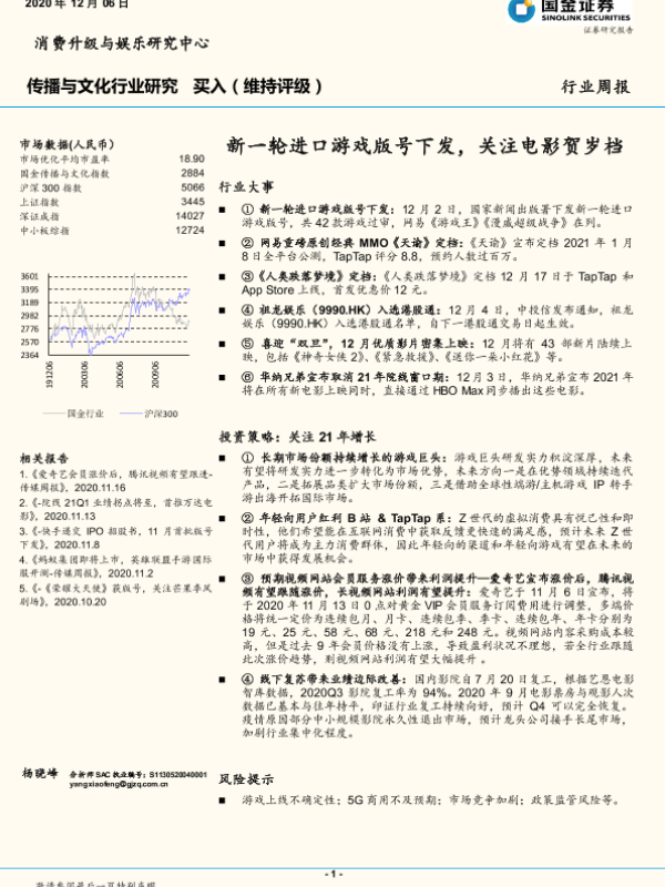 【国金证券】【20201206】20201206-国金证券-传播与文化行业研究周报:新一轮进口游戏版号下发,关注电影贺岁档-9页 行业研究