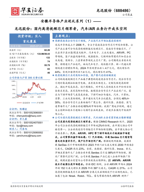 【华安证券】【20250729】龙迅股份:国内高清视频芯片领军者,汽车/AR业务打开成长空间-32页 证券期货研究报告