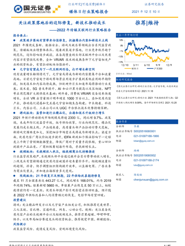 【国元证券】【20211210】2022年传媒互联网行业策略报告:关注政策落地后的边际修复,新技术推动成长-57页 行业研究