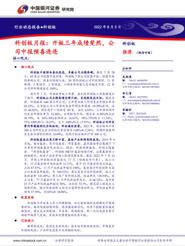 【银河证券】【20220805】科创板月报:开板三年成绩斐然,公司中报预喜连连-22页 行业研究