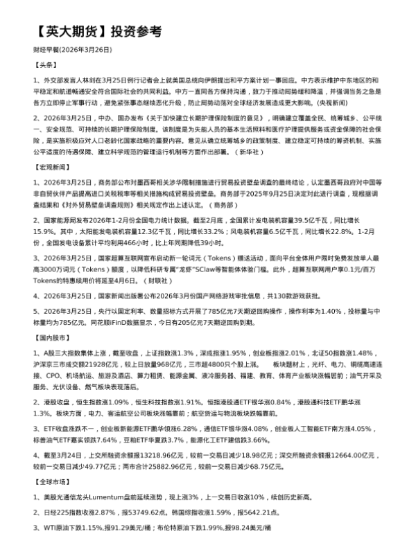 【英大期货】【202603】投资参考 财经早餐(2026年3月26日)-3页 证券期货研究报告