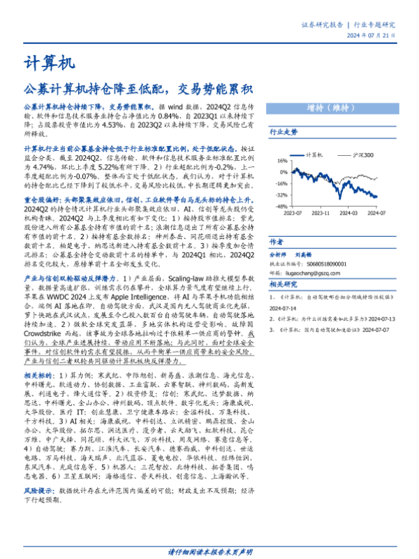 【国盛证券】【20240721】计算机行业专题研究:公募计算机持仓降至低配,交易势能累积-14页 行业研究