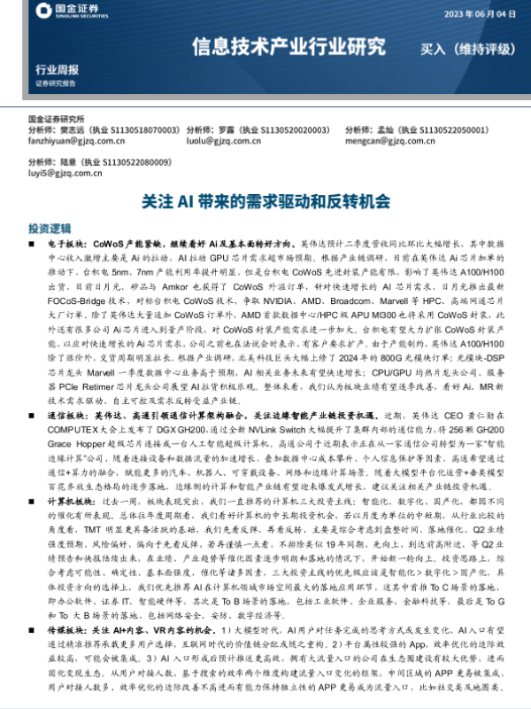 【国金证券】【20230604】信息技术产业行业周报:关注AI带来的需求驱动和反转机会-23页 行业研究