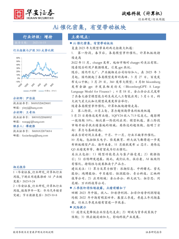 【华安证券】【20231015】20231015-华安证券-战略科技(计算机)行业周报:Ai催化密集,有望带动板块-15页 行业研究