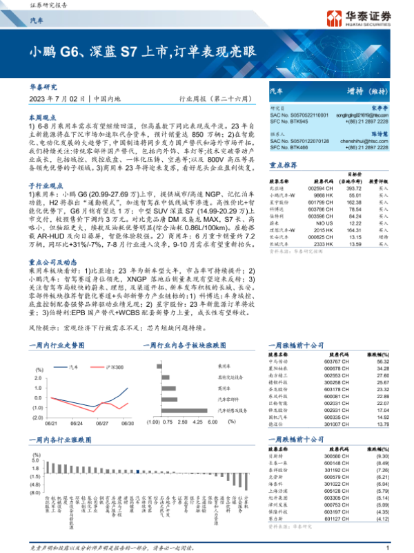 【华泰证券】【20230702】20230702-华泰证券-汽车行业周报(第二十六周):小鹏G6、深蓝S7上市,订单表现亮眼-24页 行业研究
