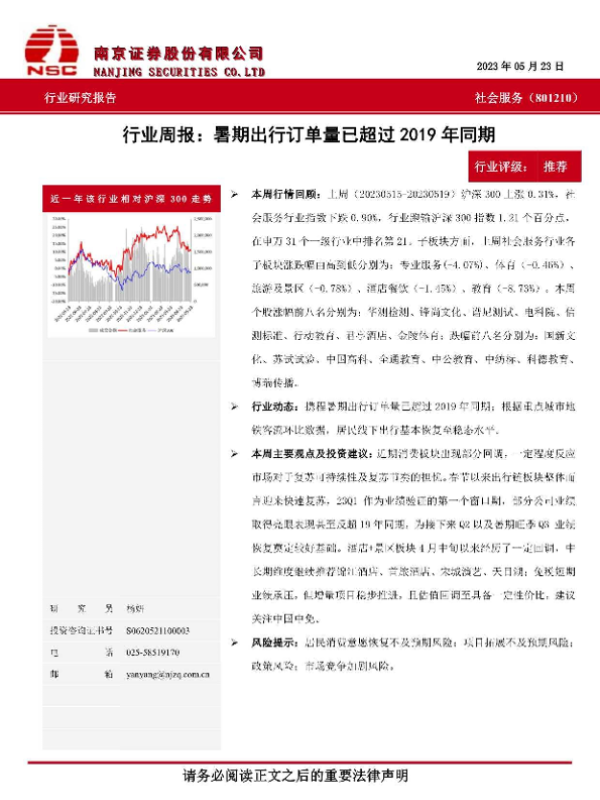 【南京证券】【20230523】社会服务行业周报_暑期出行订单量已超过2019年同期-6页 行业研究
