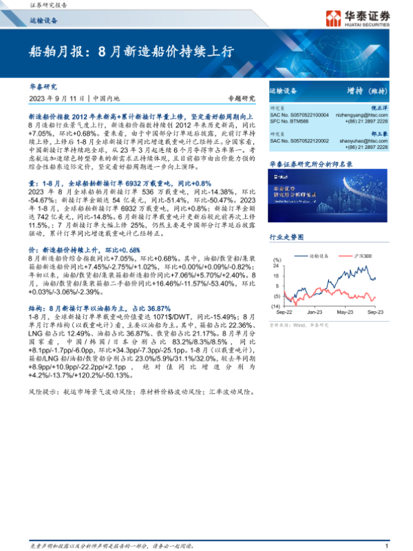 【华泰证券】【20230911】运输设备行业专题研究:船舶月报,8月新造船价持续上行-15页 行业研究