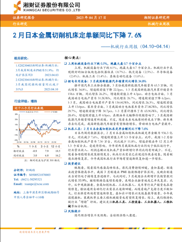【湘财证券】【20230417】机械行业周报:2月日本金属切削机床定单额同比下降7.6%-15页 行业研究