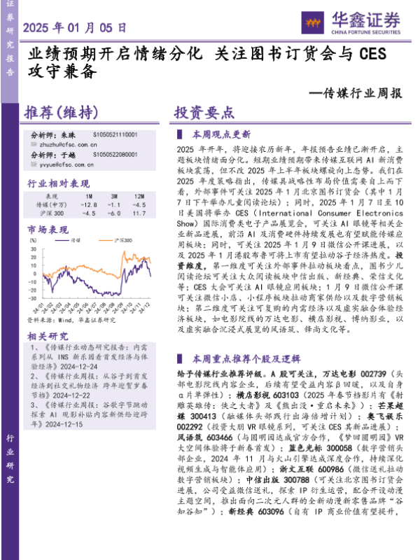 【华鑫证券】【20250105】传媒行业周报:业绩预期开启情绪分化 关注图书订货会与CES攻守兼备-20页 行业研究
