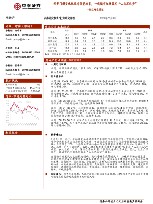 【东方证券】【20230904】房地产行业2023年第35周地产周报:“831”政策组合+北上广深落地“认房不认贷”,需求端政策力度超预期-16页 行业研究