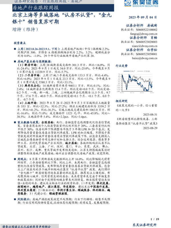 【东吴证券】【20230904】房地产行业跟踪周报:北京上海等多城落地“认房不认贷”,“金九银十”销售复苏可期-19页 行业研究