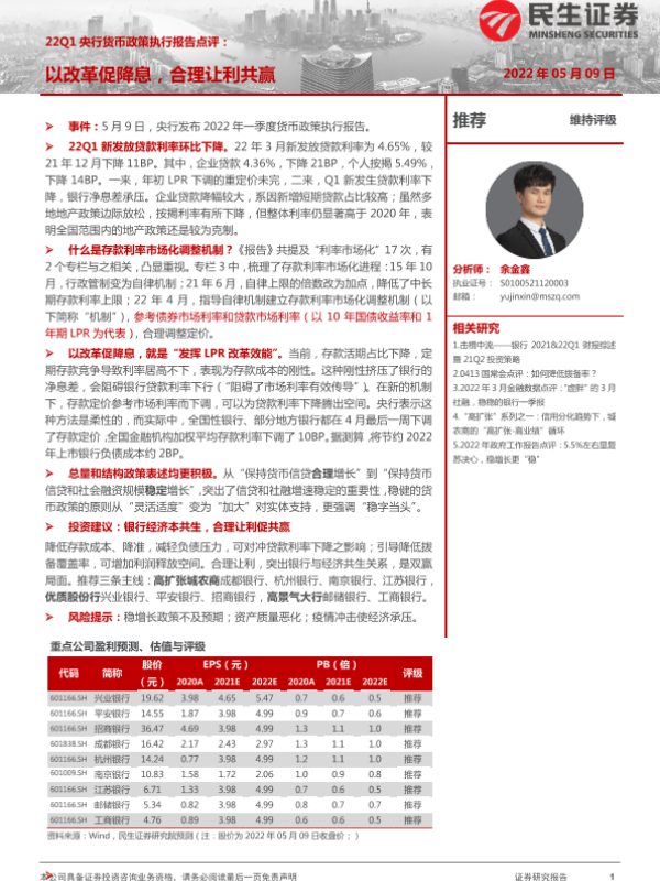 【民生证券】【20220509】22Q1央行货币政策执行报告点评:以改革促降息,合理让利共赢-4页 行业研究