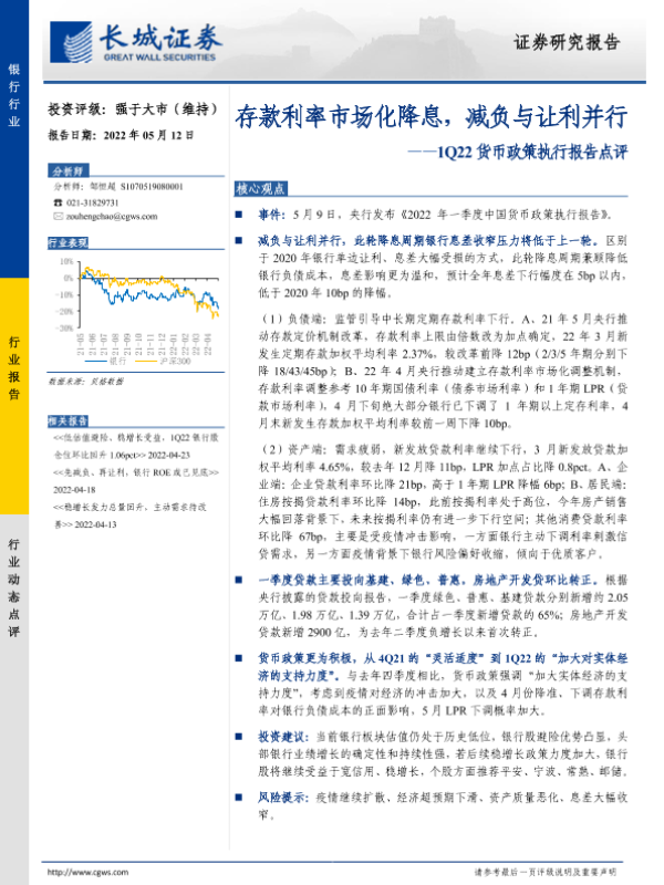 【长城证券】【20220513】银行1Q22货币政策执行报告点评:存款利率市场化降息,减负与让利并行-3页 行业研究