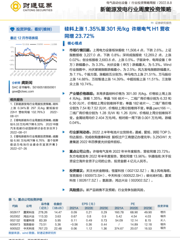 【财通证券】【20220808】20220808-财通证券-新能源发电行业周度投资策略:硅料上涨1.35%至301元 kg 许继电气H1营收同增23.72%-20页 行业研究