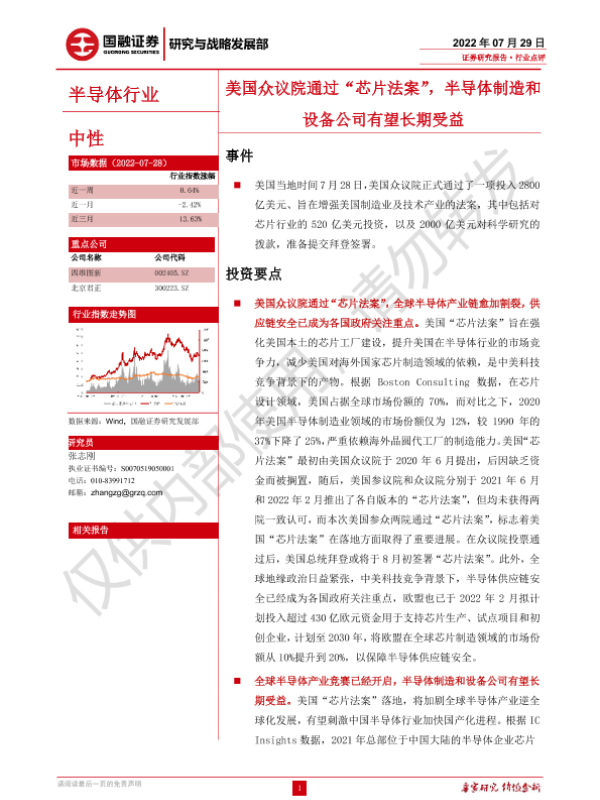 【国融证券】【20220729】半导体行业:美国众议院通过“芯片法案”,半导体制造和设备公司有望长期受益-3页 行业研究