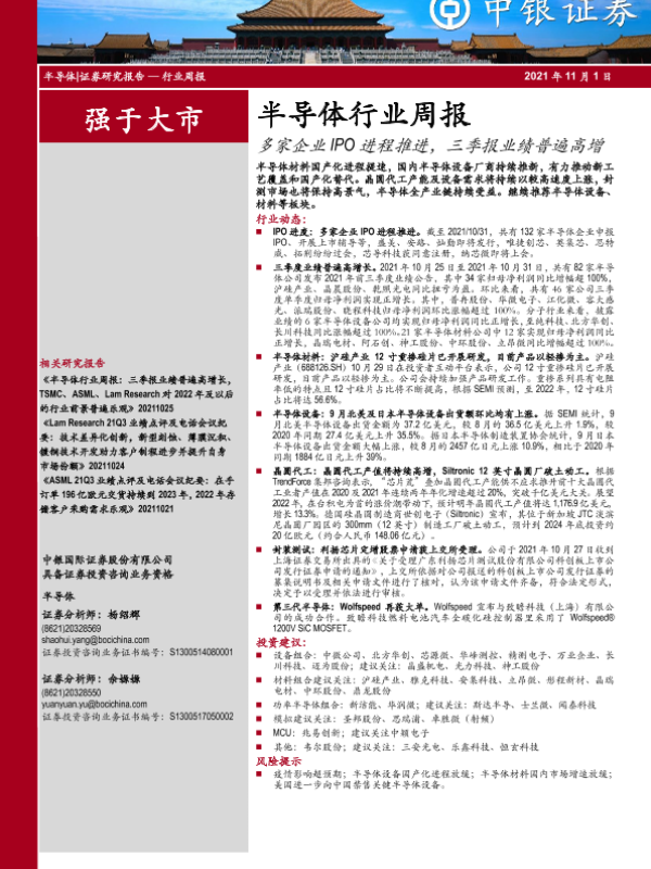 【中银证券】【20211101】半导体行业周报:多家企业IPO进程推进,三季报业绩普遍高增-28页 行业研究