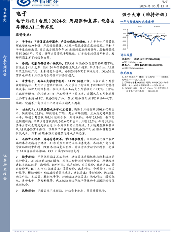 【华福证券】【20240613】电子月报(台股)2024-5:周期温和复苏,设备&存储&AI三箭齐发-22页 行业研究
