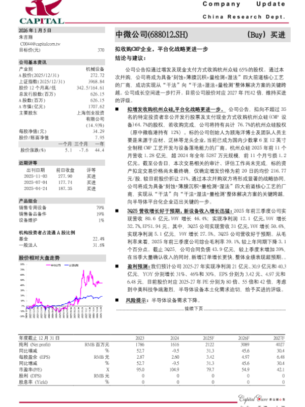 【东吴证券】【202512】中微公司(688012):拟收购杭州众硅布局 CMP设备,平台化布局提速-3页 证券期货研究报告