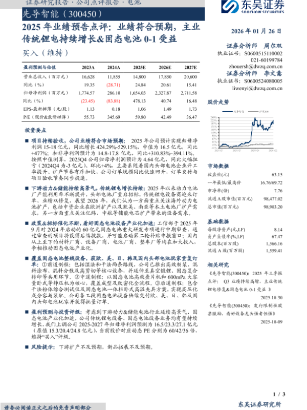 【东吴证券】【202601】2025年业绩预告点评:业绩符合预期,主业传统锂电持续增长&固态电池0-1受益-3页 证券期货研究报告