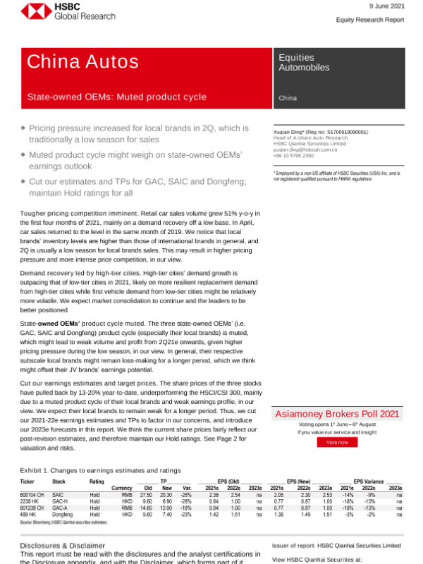 【HSBC Qianhai Securities Limited】【20210609】HSBC-中国汽车行业-国有原始设备制造商:沉默的产品周期-24页 行业研究