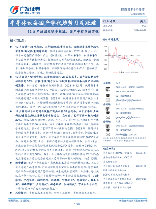 【广发证券】【20240122】20240122-广发证券-半导体设备国产替代趋势月度跟踪:12月产线招标稳步推进,国产中标多线突破-20页 行业研究